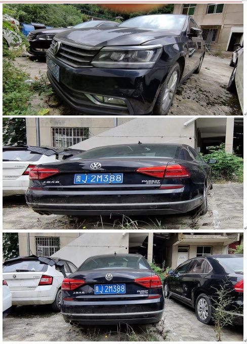 車(chē)輛原號(hào)牌為“貴J2M388”的大眾汽車(chē)牌SVW71410BL型帕薩特小型汽車(chē),因停放時(shí)間較長(zhǎng),無(wú)法啟動(dòng),無(wú)法查看儀表數(shù)據(jù),車(chē)輛外觀積灰較多, |