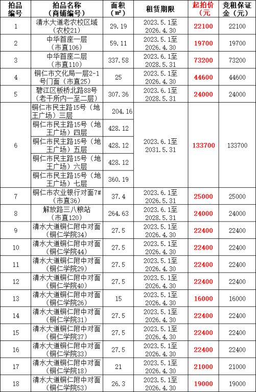拍品14號(hào)至16號(hào)標(biāo)的:位于清水大道銅仁附中對(duì)面,面積均為:27.5㎡,租賃期均為3年(2023.5.1至2026.4.30),附近有車站、醫(yī)院、銀行、酒店、超市、學(xué)校等,交通便利,人流量大。