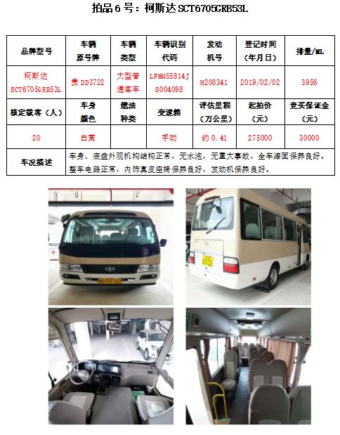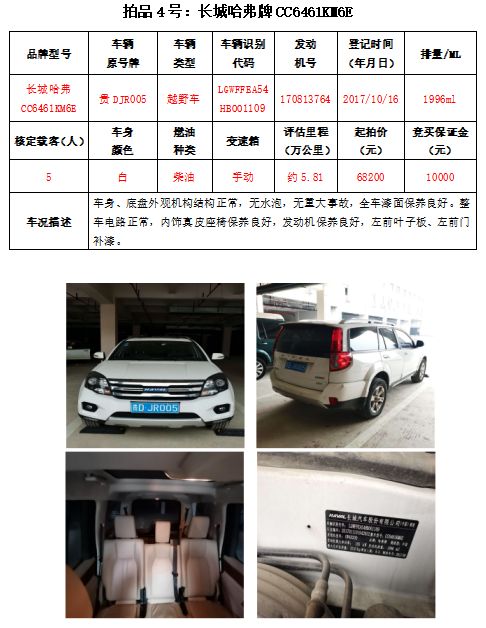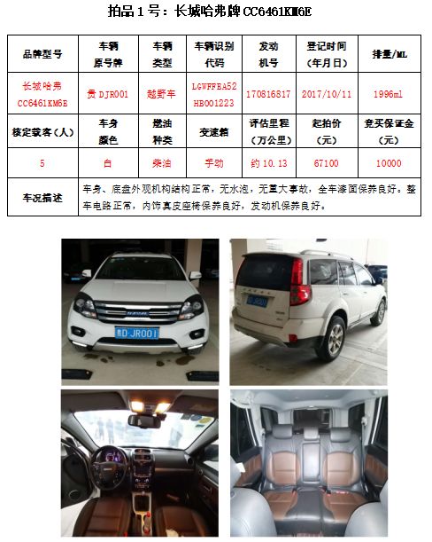 受銅仁北站客運有限公司委托,本公司定于2020年11月27日(星期五)下午14:30時,在銅仁市碧江區(qū)川硐教育園區(qū)誠信路銅仁市公共資源交易中心開標(biāo)六室(拍賣大廳)公開拍賣:長城哈弗(越野車4輛)、路虎發(fā)現(xiàn)(越野車1輛)、柯斯達(dá)(大型普通客車1輛)共計6輛車。
