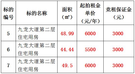 5、九龍大道第二層住宅用房1號(hào)、2號(hào)、3號(hào),面積分別為:48.99㎡、44.44㎡、49.5㎡,租賃期均為:3年,起拍租金單價(jià)分別為:6000/年、5500/年、6000/年,競(jìng)租保證金分別為:3000元;