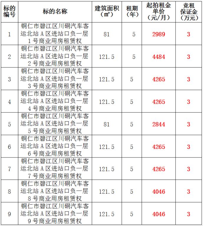 9、銅仁市碧江區(qū)川硐汽車客運(yùn)北站A區(qū)進(jìn)站口負(fù)一層9號門面租賃權(quán),面積:121.5㎡,租賃期:5年,起拍租金單價(jià):4046元/月,競租保證金:3萬元。