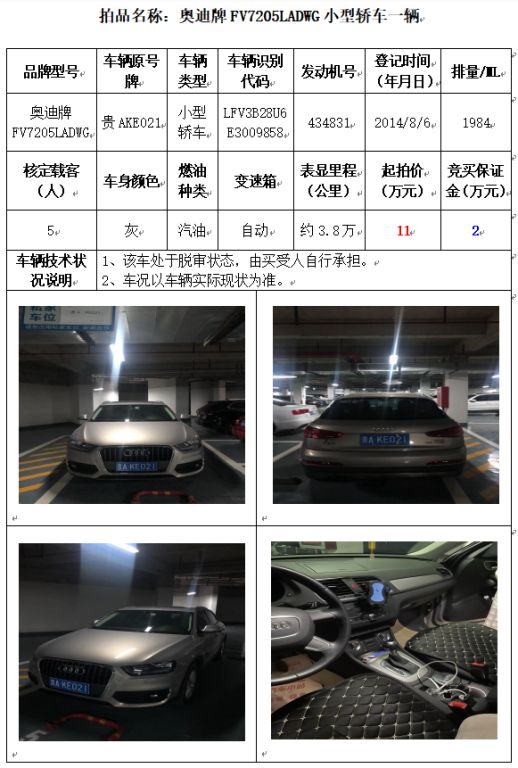 貴州春秋拍賣(mài) 奧迪牌、雅閣牌等3輛機(jī)動(dòng)車(chē)拍賣(mài)公告