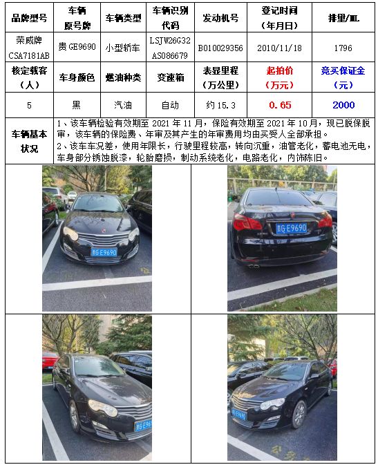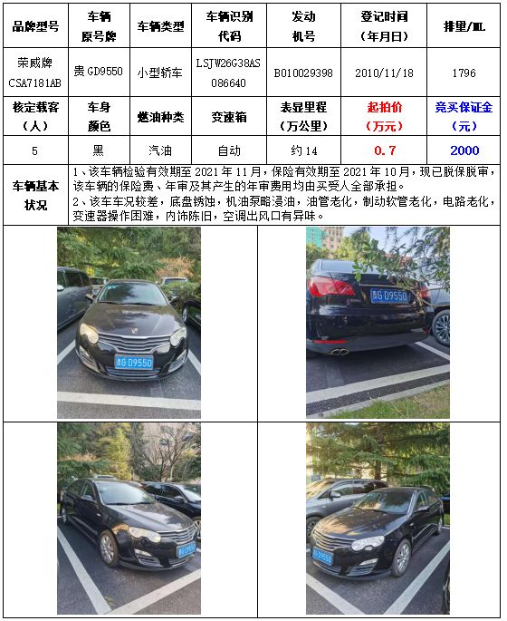 拍品編號2:榮威牌CSA7181AB小型轎車一輛