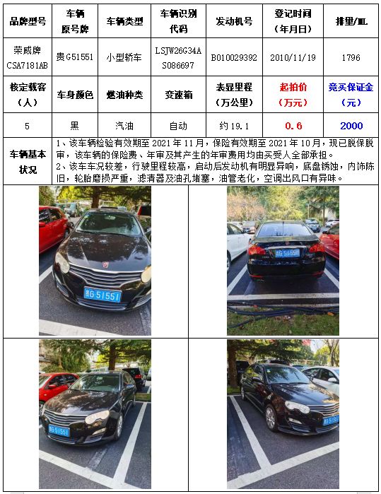 拍品編號1:榮威牌CSA7181AB小型轎車一輛