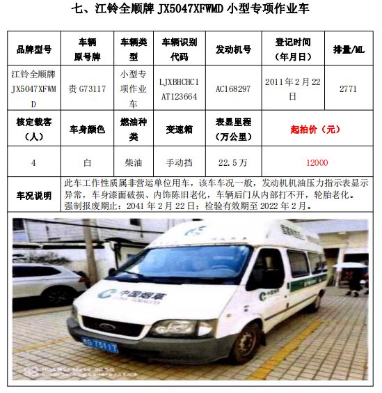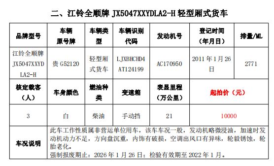 大通牌SH5041XXYA7D4輕型廂式貨車2輛、大通牌SH5041XXYA6D4輕型廂式貨車1輛、江鈴全順牌JX5047XXYDLA2-H輕型廂式貨車2輛、江鈴全順牌JX5047XFWMD小型專項作業(yè)車1輛、五十鈴牌QL1020UGDSC輕型普通貨車1輛、獵豹牌CFA6470M3小型普通客車1輛、獵豹牌CFA6470LA小型越野客車1輛,共計9輛車整體拍賣。