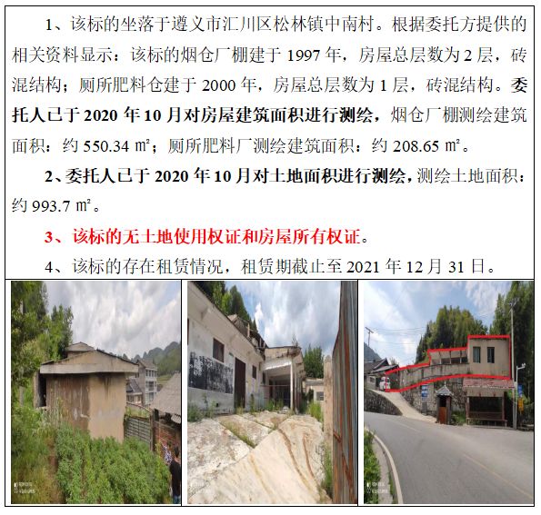 4、松林站中南點煙倉廠棚、廁所肥料倉,測繪建筑總面積:約758.99㎡,測繪土地面積:約993.7㎡,起拍價:10.5萬元;