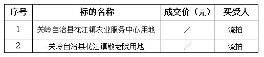 受委托,我公司于2022年1月7日(星期五)下午14:30在關嶺布依族苗族自治縣頂云天書酒店旁城投集團二樓會議室面向社會公開拍賣關嶺自治縣花江鎮(zhèn)農(nóng)業(yè)服務中心用地和關嶺自治縣花江鎮(zhèn)敬老院用地,其結果如下: