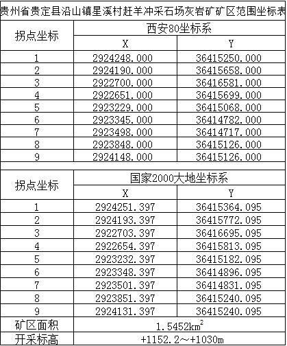 拍賣采礦權(quán)名稱貴定縣沿山鎮(zhèn)星溪村趕羊沖采石場灰?guī)r礦采礦權(quán),根據(jù)國土部門批準劃定的礦區(qū)范圍,礦區(qū)面積為1.5452平方千米,開采標高+1152.2~+1030米,礦區(qū)拐點坐標如下: