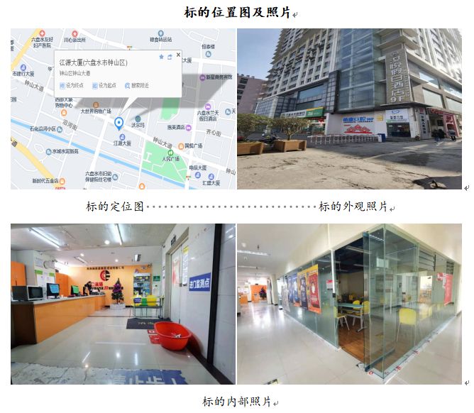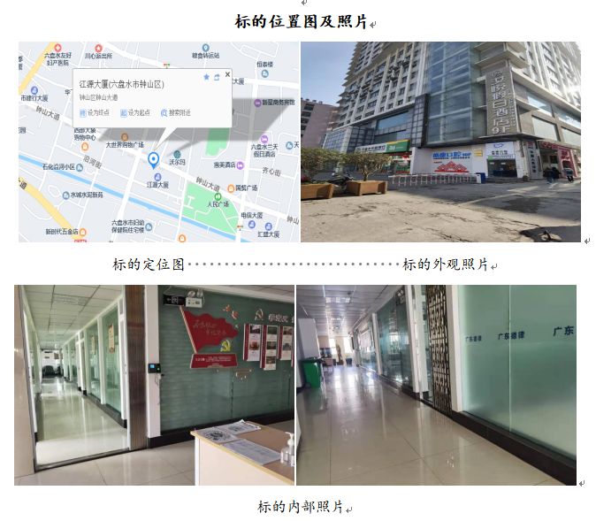 標(biāo)的位于六盤水市鐘山區(qū)鐘山中路江源大廈46號(hào)6層601室的商業(yè)房地產(chǎn),建筑面積為1181.04㎡,樓幢總層數(shù)為27層,所在樓憧為鋼筋混凝土結(jié)構(gòu),建成于2010年。