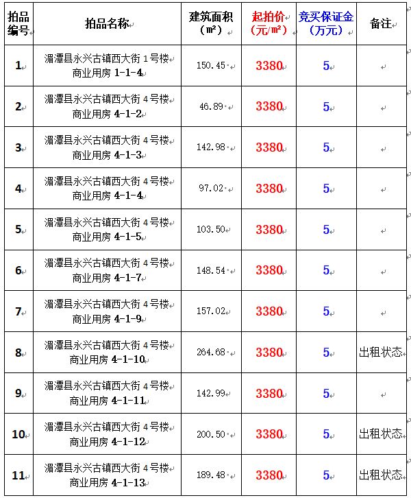 該批標(biāo)的位于湄潭縣永興鎮(zhèn)西大街臨街商鋪,共計(jì)11間(建筑面積:46.89㎡—264.68㎡)。標(biāo)的坐西向東,均為臨街商鋪,房屋結(jié)構(gòu)為框混結(jié)構(gòu),規(guī)劃用途為商業(yè)營業(yè)用房,建成于2015年5月,土地使用權(quán)年限為50年,截止日期至2059年11月;水、電設(shè)施齊全。