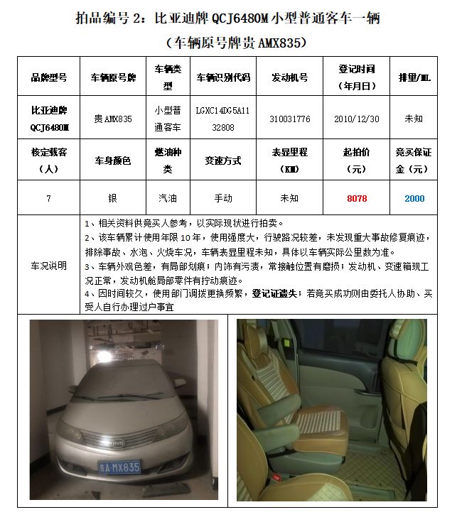 拍品編號2原車牌號貴AMX835比亞迪牌QCJ6480M小型普通客車一輛;