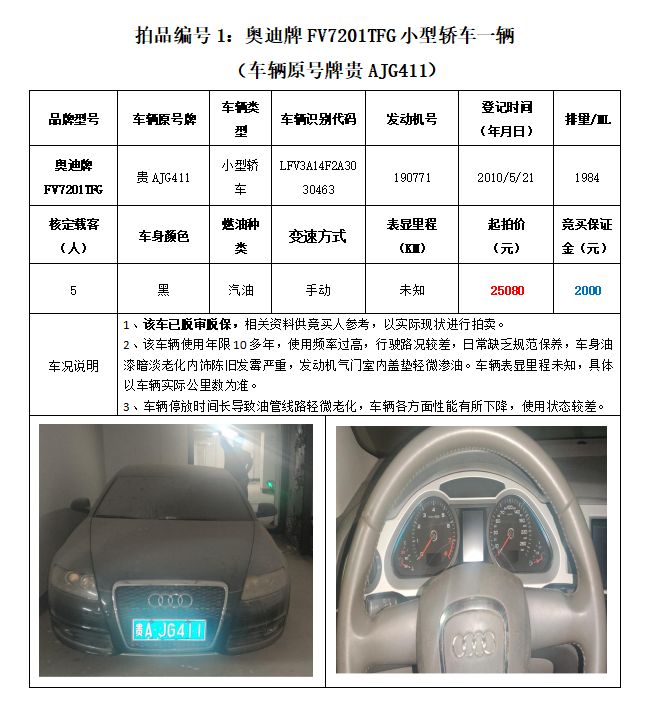 拍品編號1原車牌號貴AJG411奧迪牌FV7201TFG小型轎車一輛;
