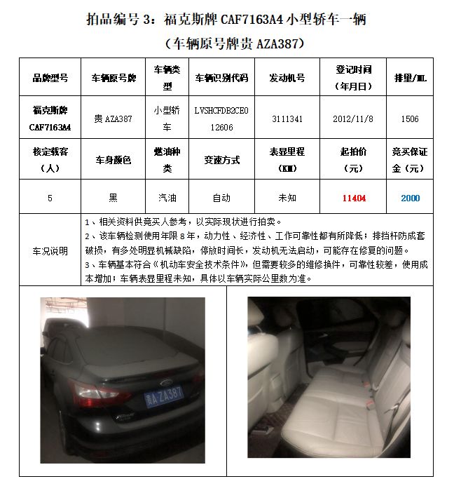 拍品編號3:原車牌號貴AZA387??怂古?/span>CAF7163A4小型轎車一輛;