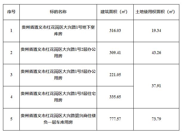 2、貴州省遵義市紅花崗區(qū)大興路1號地下室?guī)旆浚偨ㄖ娣e:316.03㎡);貴州省遵義市紅花崗區(qū)大興路1號2層辦公用房(總建筑面積:309.41㎡);貴州省遵義市紅花崗區(qū)大興路1號5層辦公用房(總建筑面積:221.05㎡);貴州省遵義市紅花崗區(qū)大興路1號5層住宅用房(總建筑面積:335.65㎡);貴州省遵義市紅花崗區(qū)大興路碧興商住樓負(fù)一層車庫用房(總建筑面積:777.57㎡)。