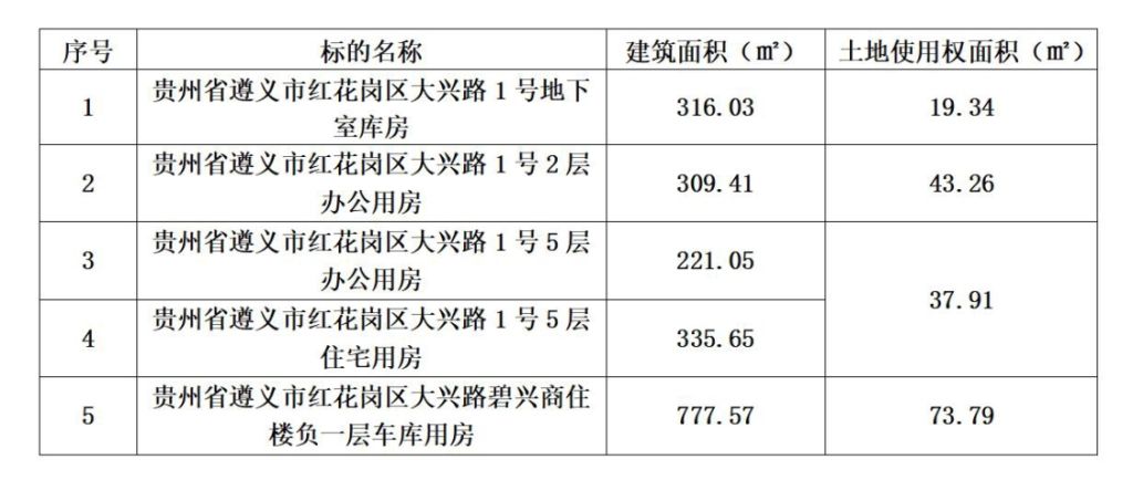 拍品編號1:貴州省遵義市紅花崗大興路地下室、辦公樓、住宅、車庫(整體拍賣)