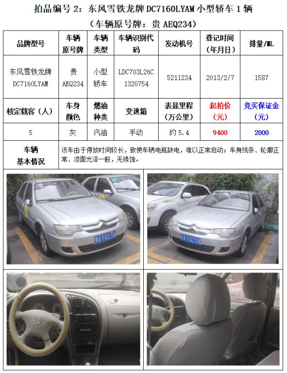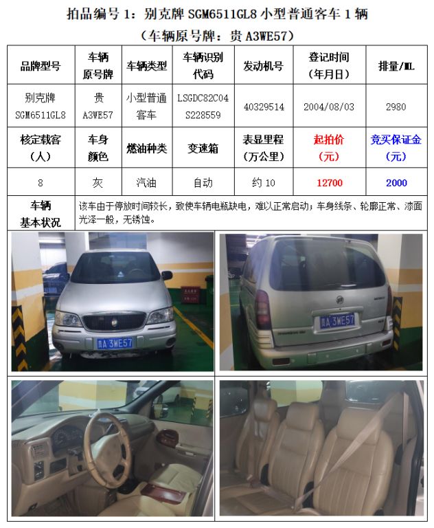 別克牌SGM6511GL8小型普通客車1輛;東風雪鐵龍牌DC7160LYAM小型轎車1輛。