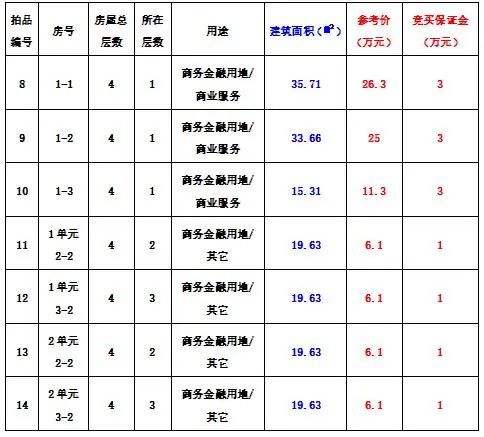 該批標(biāo)的均坐落于貴州省遵義市湄潭縣湄江街道茶鄉(xiāng)北路,房屋建筑面積15.31㎡-35.71㎡,樓層:共4層,層高:1層約3.5m,2-3層約2.8m;權(quán)利類(lèi)型:國(guó)有建設(shè)用地使用權(quán)/房屋(構(gòu)筑物)所有權(quán);權(quán)利性質(zhì):國(guó)有土地/作價(jià)出資(入股)/自建房;房屋結(jié)構(gòu):混合結(jié)構(gòu),使用期限至2048年12月15日;目前用作倉(cāng)庫(kù)等。