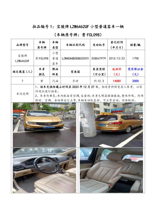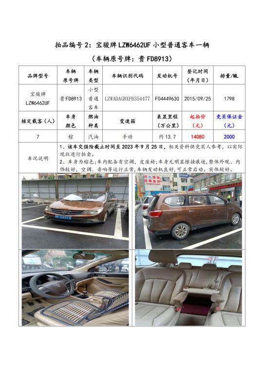 拍品編號(hào)2:寶駿牌LZW6462UF小型普通客車一輛(車輛原號(hào)牌:貴FD8913);