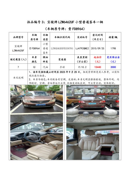 拍品編號(hào)3:寶駿牌LZW6462UF小型普通客車一輛(車輛原號(hào)牌:貴FD8964);