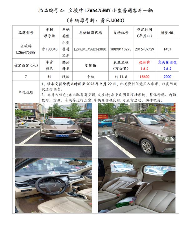 拍品編號(hào)4:寶駿牌LZW6475BMY小型普通客車一輛(車輛原號(hào)牌:貴FJJ040);