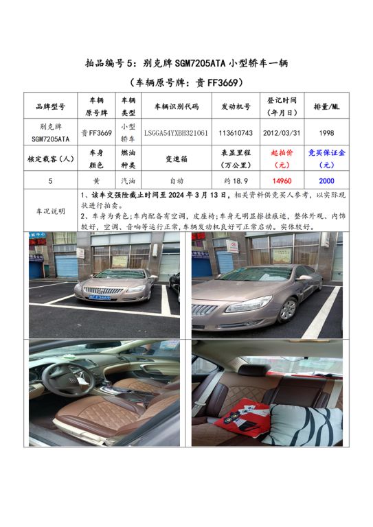 拍品編號(hào)5:別克牌SGM7205ATA小型轎車一輛(車輛原號(hào)牌:貴FF3669);