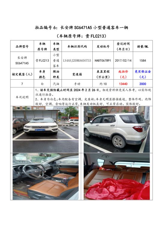拍品編號(hào)6:長(zhǎng)安牌SC6471A5小型普通客車一輛(車輛原號(hào)牌:貴FLC213);