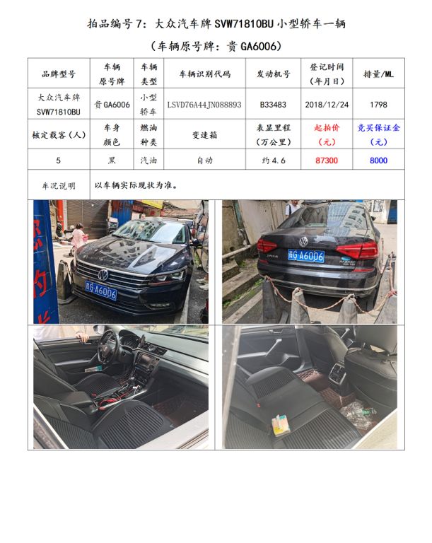 拍品編號(hào)7:大眾汽車牌SVW71810BU小型轎車一輛(車輛原號(hào)牌:貴GA6006)。