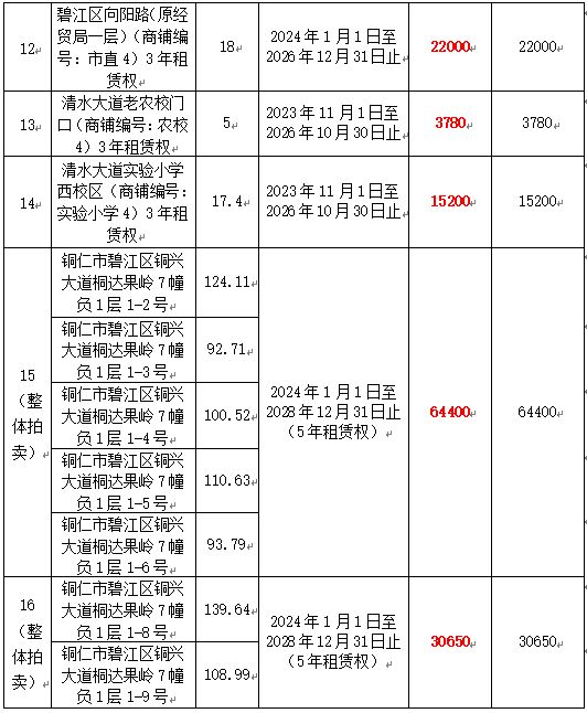 12、碧江區(qū)向陽路(原經(jīng)貿(mào)局一層)(商鋪編號:市直4)3年租賃權(quán),面積:18㎡,租賃期:2024年1月1日至2026年12月31日止,起拍價:22000元/年,競租保證金:22000元;