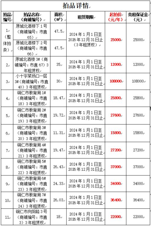 11、銅仁市向陽路3號(商鋪編號:市直3)3年租賃權(quán),面積:18㎡,租賃期:2024年1月1日至2026年12月31日止,起拍價:22000元/年,競租保證金:22000元;