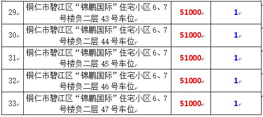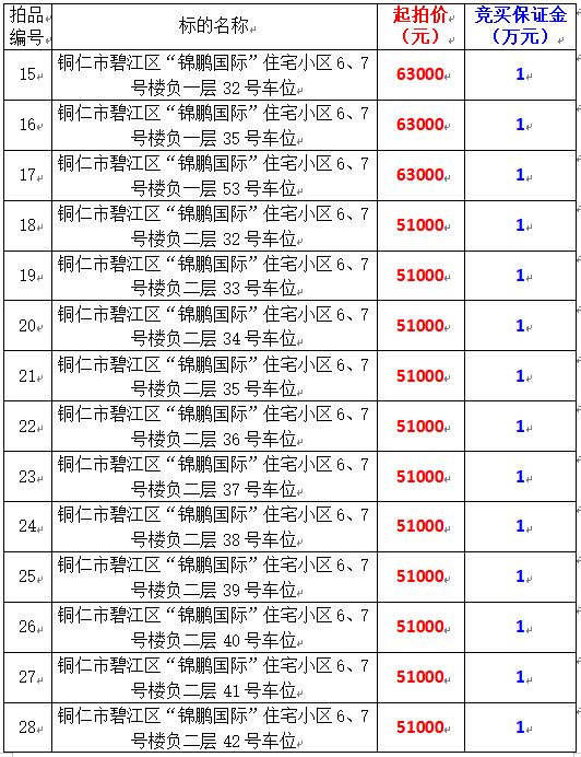 5、銅仁市碧江區(qū)“錦鵬國際”住宅小區(qū)6、7號樓負(fù)一層;32號、35號、53號,負(fù)二層;32號-47號共計19個車位,起拍價:51000元-63000元,競買保證金:1萬元/個。