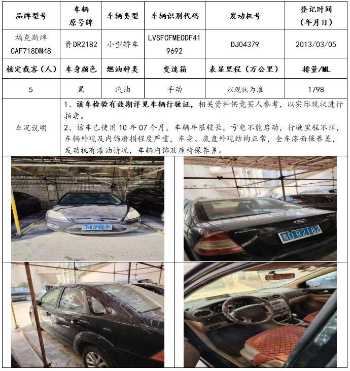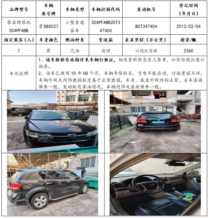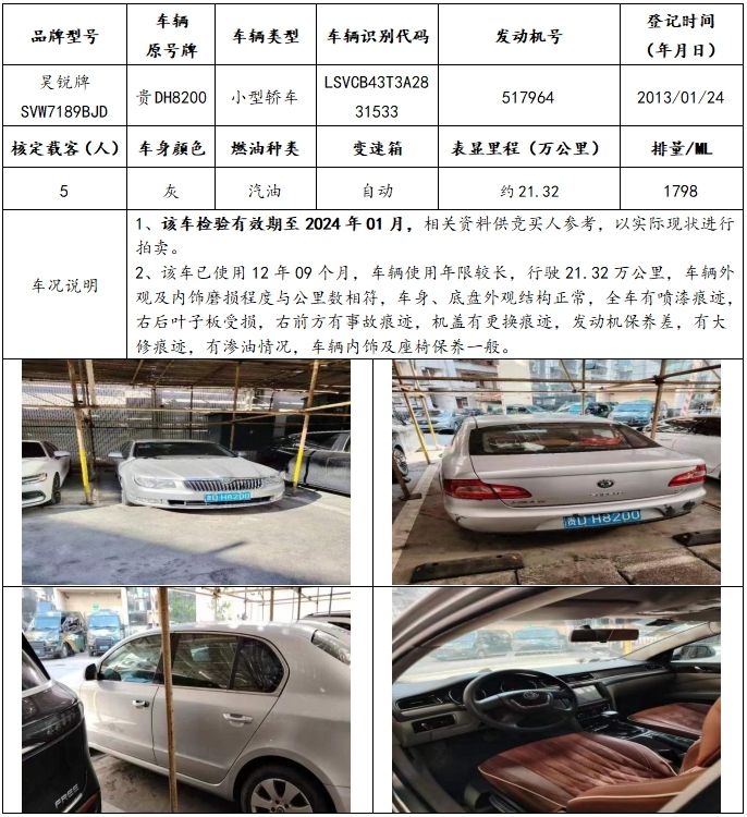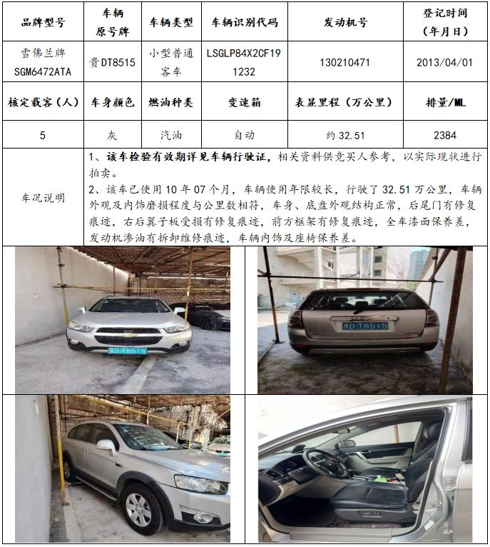 拍品編號1:菲亞特牌、??怂古?、雪佛蘭牌、昊銳牌等共4輛(整體拍賣)。一、展樣時間:公告之日起至2023年12月15日(工作日上午9:00—下午17:00)二、展樣地點:標的物所在地(請聯系我公司查看標的)三、報名時間:公告之日起至2023年12月19日12:00(以保證金到賬時間為準。)(https://paimai.caa123.org.cn/pages/meeting/conference.html?id=253855)1、請在中拍平臺上完成注冊登記,并上傳有效身份證明進行實名認證(個人:身份證原件;企業(yè):營業(yè)執(zhí)照、法人身份證照片)2、意向競買人應在規(guī)定報名時間內交納競買保證金及資料服務費300元/輛(資料服務費不退)到我公司指定銀行賬戶,取得競買資格。六、其他說明:為保證報名成功,避免轉賬失敗等情況,競買人轉賬后請及時與我公司聯系,確認其競買資格。七、公司地址:貴州省貴陽市南明區(qū)中華南路20號新大陸廣場10樓D座