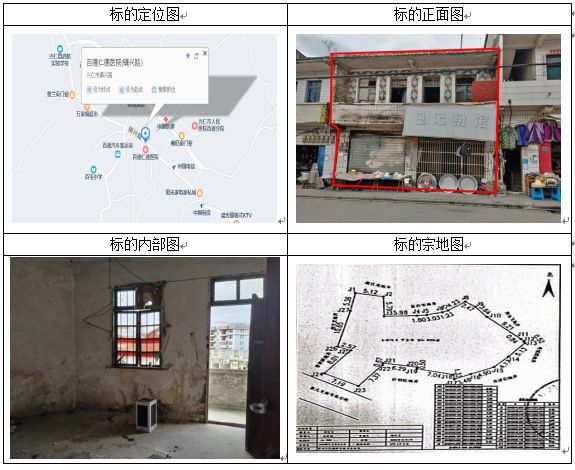 標(biāo)的坐落于貴州省興仁市屯腳鎮(zhèn)街上,房屋總層數(shù)4層,共有宗地面積401.37㎡,房屋建筑面積:607.4㎡,房屋結(jié)構(gòu):混合結(jié)構(gòu),房屋產(chǎn)權(quán)證號:黔(2023)興仁市不動產(chǎn)權(quán)第0005222號,權(quán)利類型:國有建設(shè)用地使用權(quán)/房屋所有權(quán),權(quán)利性質(zhì):出讓/自建房,用途:商務(wù)金融用地/商業(yè)、金融、信息,使用期限:2012年9月29日起2052年9月28日止。