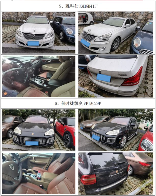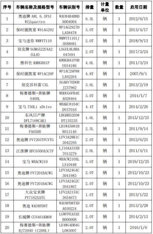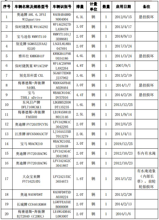 拍品編號1:保時捷凱宴、寶馬、梅賽德斯-奔馳牌、奧迪、別克、雅科仕、東風日產(chǎn)牌、江淮牌、大眾寶來牌、長城牌等車輛,共計20輛(整體拍賣)