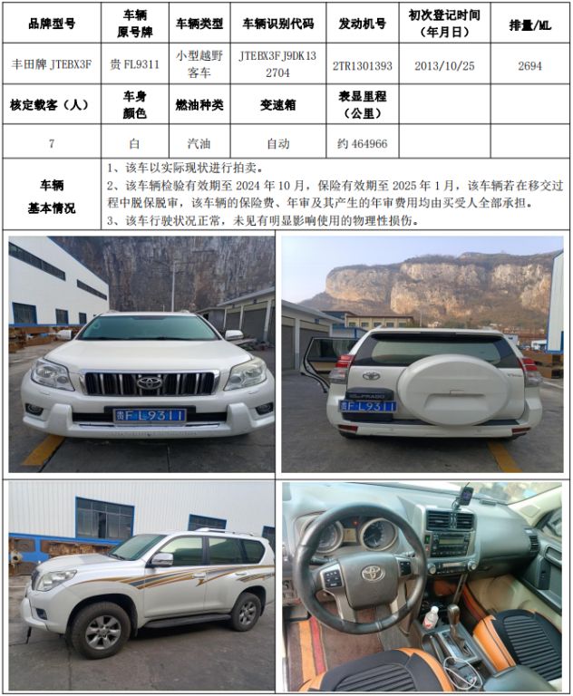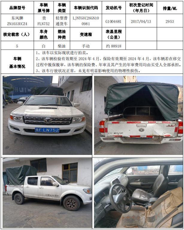 拍品編號1:豐田牌JTEBX3F小型越野客車、東風(fēng)牌ZN1033UCZ4輕型普通貨車,共計(jì)2輛,整體拍賣