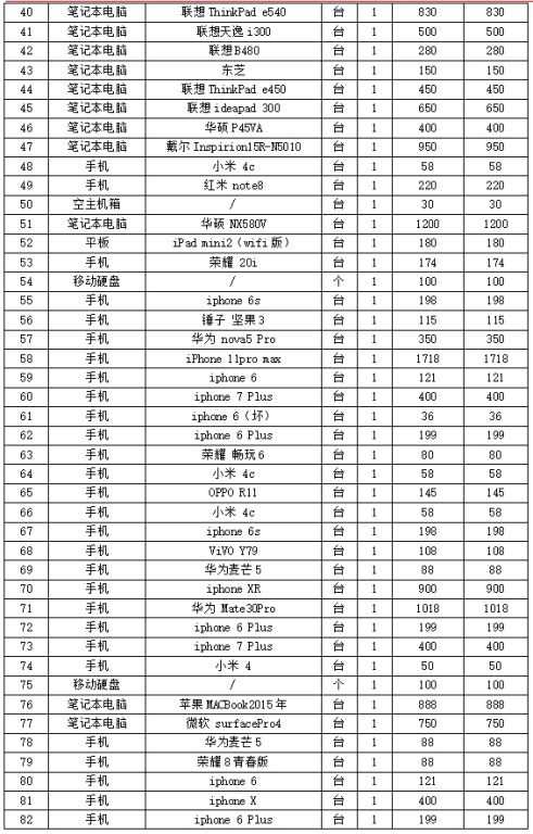 “手機、電腦、等電子相關(guān)設備”一批(整體拍賣),各類品牌手機76部、筆記本電腦16臺、移動硬盤2個、電腦主機16臺、空主機箱1個、平板1臺)(詳見后附清單)。