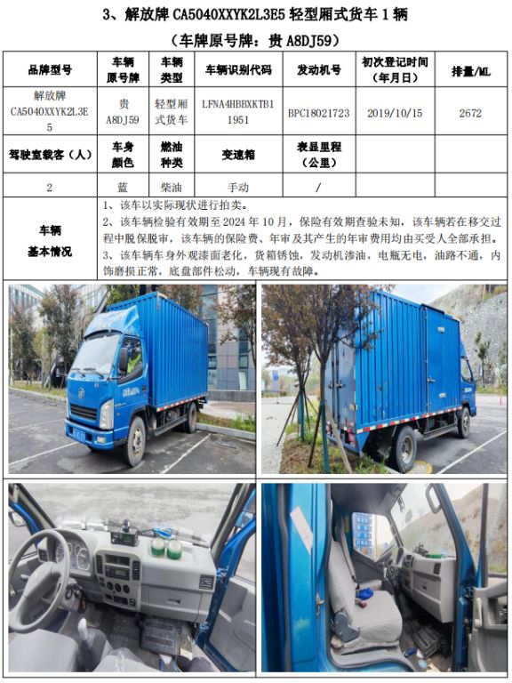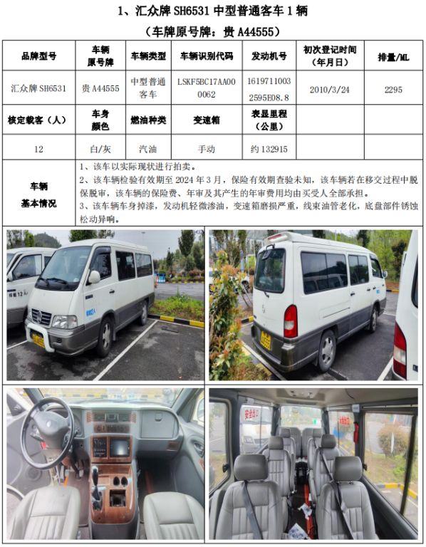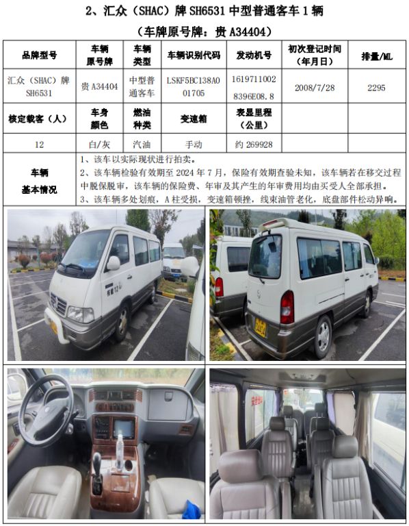 拍品編號1:匯眾牌SH6531中型普通客車、匯眾(SHAC)牌SH6531中型普通客車、解放牌CA5040XXYK2L3E5輕型廂式貨車,共計3輛,整體拍賣