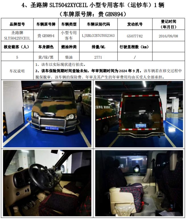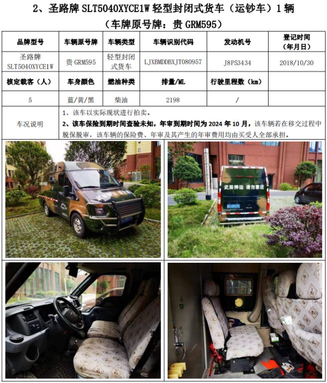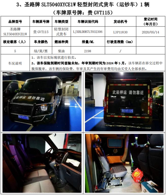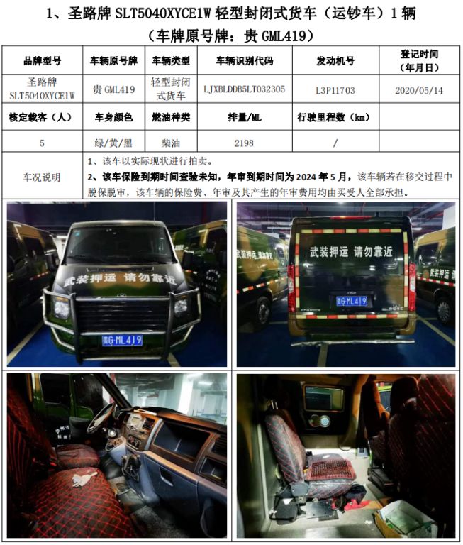 拍品編號1:圣路牌SLT5040XYCE1W輕型封閉式貨車(運鈔車)3輛、圣路牌SLT5042XYCEIL小型專用客車(運鈔車)1輛,共4輛,整體拍賣