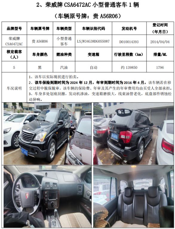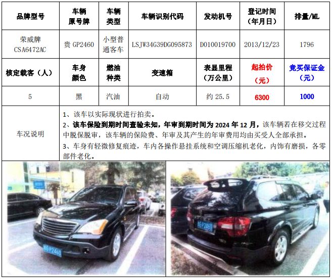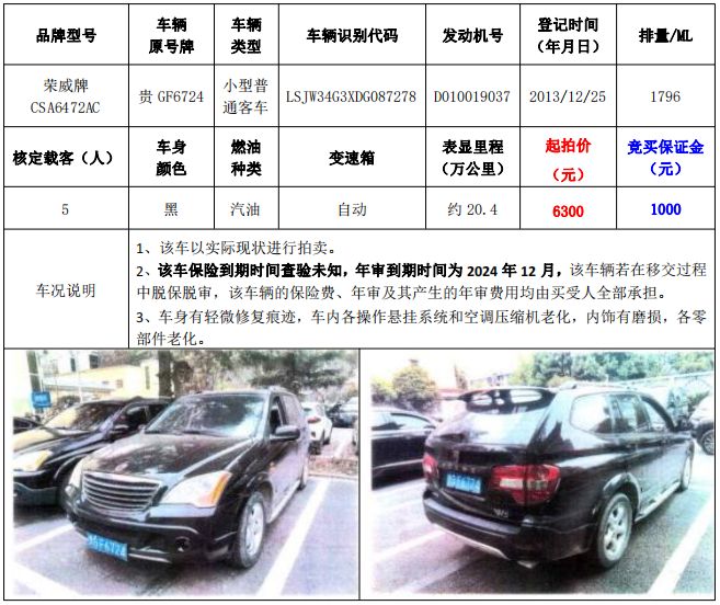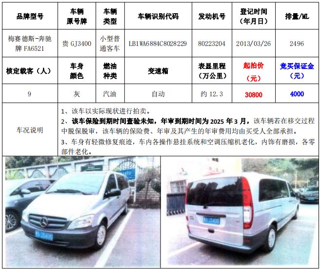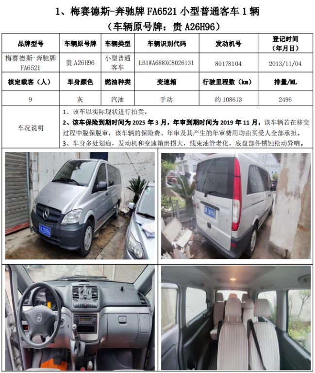 拍品編號1:梅賽德斯-奔馳牌FA6521小型普通客車1輛、榮威牌CSA6472AC小型普通客車1輛,共計(jì)2輛(整體拍賣)