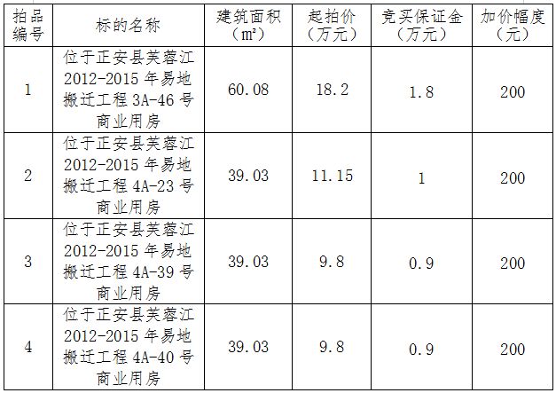 【07月31日】位于貴州省遵義市正安縣芙蓉江 2012-2015 年易地搬遷工程 3A-46 號(hào)、4A-23 號(hào)、4A-39 號(hào)、4A-40 號(hào)商業(yè)用房拍賣項(xiàng)目電子競價(jià)公告