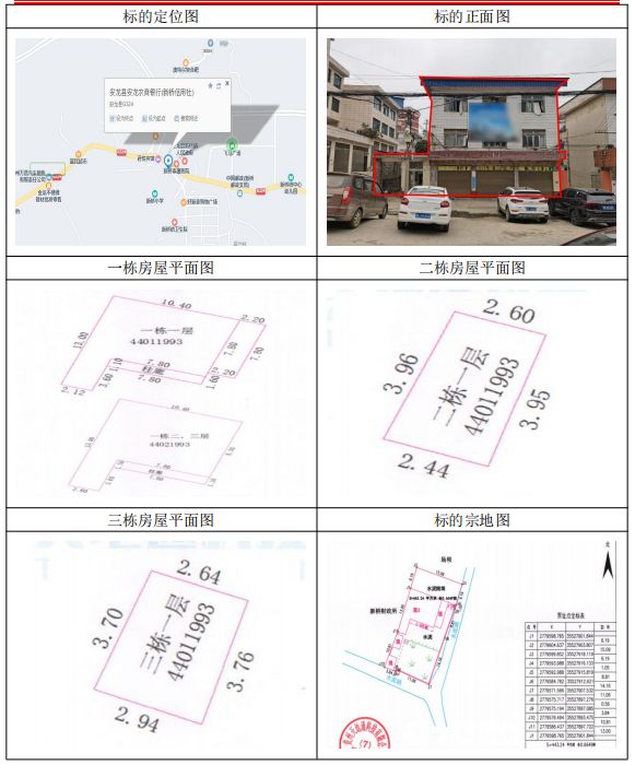 標(biāo)的坐落于安龍縣新橋鎮(zhèn)街上,房屋為自建房,由3幢房屋組成,證載總建筑面積:332.79㎡,實(shí)測(cè)總建筑面積:357.94㎡,其中1幢總層數(shù)為3層,證載建筑面積:312.26㎡,實(shí)測(cè)建筑面積:338.52㎡;2-3幢總層數(shù)為1層,所在樓層為1層,2幢證載建筑面積:10.81㎡,實(shí)測(cè)建筑面積:9㎡,3幢證載建筑面積:9.72㎡,實(shí)測(cè)建筑面積:10.42㎡。房屋產(chǎn)權(quán)證號(hào):安房權(quán)證新橋鎮(zhèn)字第00003462號(hào),設(shè)計(jì)用途分別為辦公住宅、其它,混合結(jié)構(gòu);土地使用權(quán)證號(hào):安國(guó)用(2014)第20號(hào),證載土地使用權(quán)面積:443.24㎡,實(shí)測(cè)土地使用權(quán)面積:443.24㎡,地類(lèi)(用途)金融用地,使用權(quán)類(lèi)型為出讓?zhuān)K止日期為2054年11月22日止。