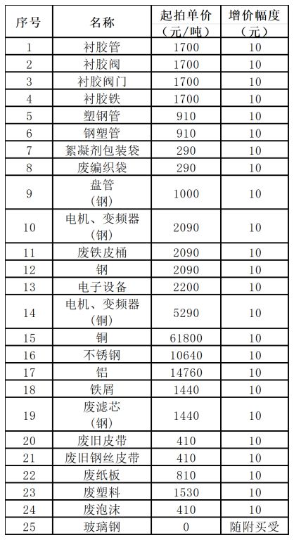 襯膠管每增加10元/噸,第2-24項廢舊材料同步增加10元/噸;買受人買受1-24項廢舊材料的同時,以起拍價隨附買受第25項廢舊材料。