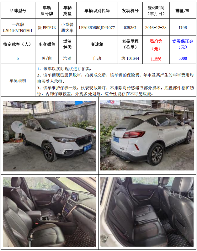 拍品編號(hào)3:一汽牌CA6462ATE5TKG1小型普通客車1輛(車輛原號(hào)牌:貴EFD273)