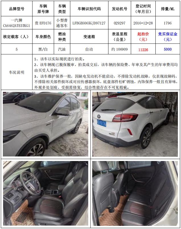 拍品編號(hào)2:一汽牌CA6462ATE5TKG1小型普通客車1輛(車輛原號(hào)牌:貴EFD175)
