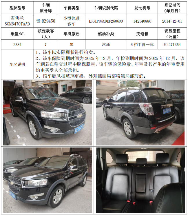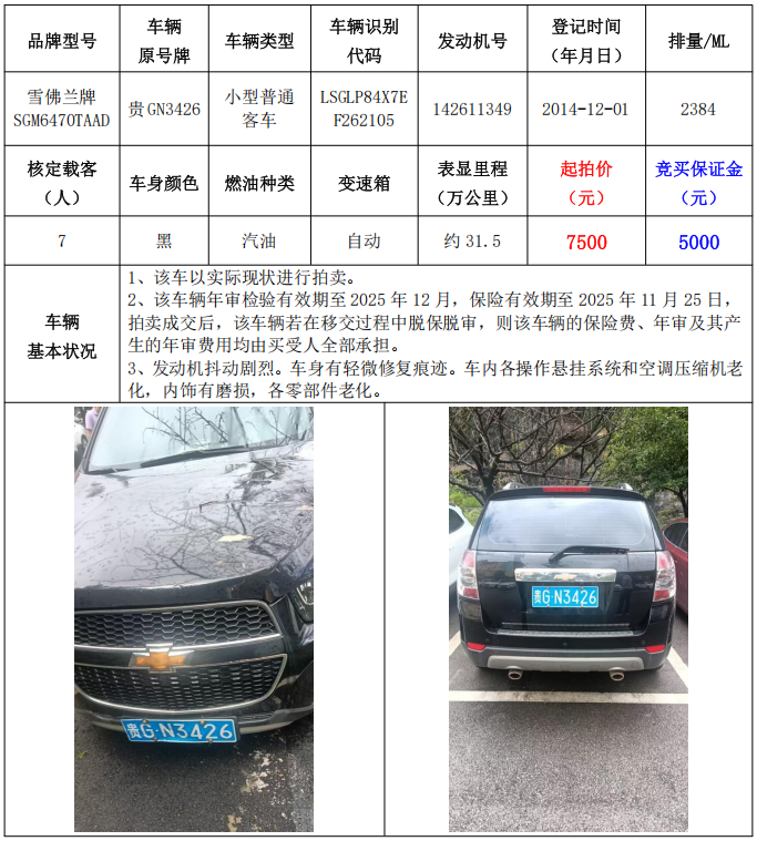 拍品編號(hào)1:雪佛蘭牌SGM6470TAAD小型普通客車(chē)(車(chē)輛原號(hào)牌:貴GN3426)