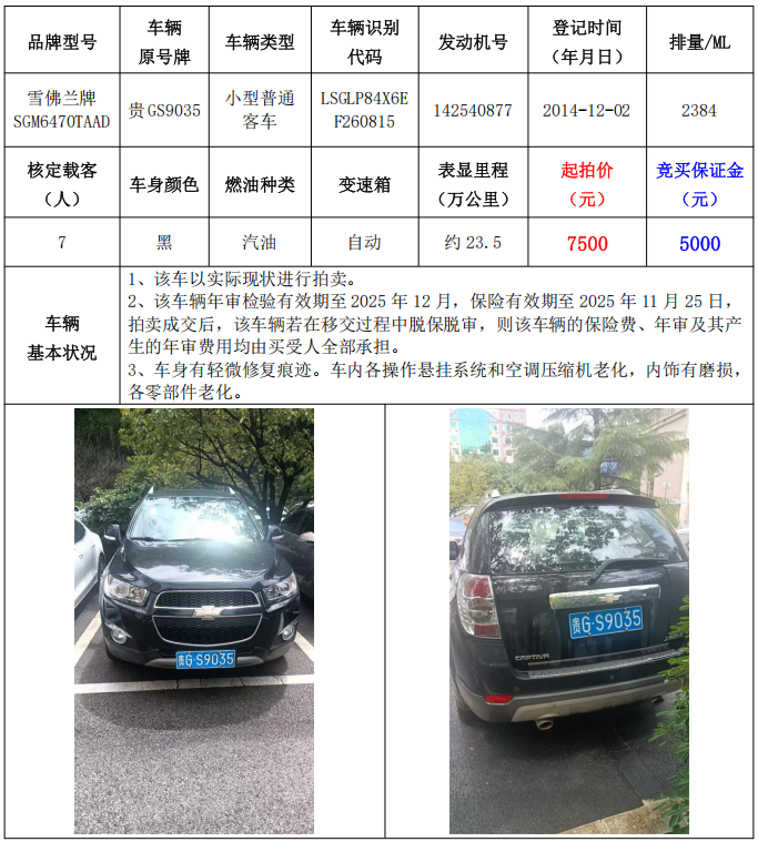 1、雪佛蘭牌SGM6470TAAD小型普通客車(chē)1輛,起拍價(jià):7500元,競(jìng)買(mǎi)保證金:5000元。