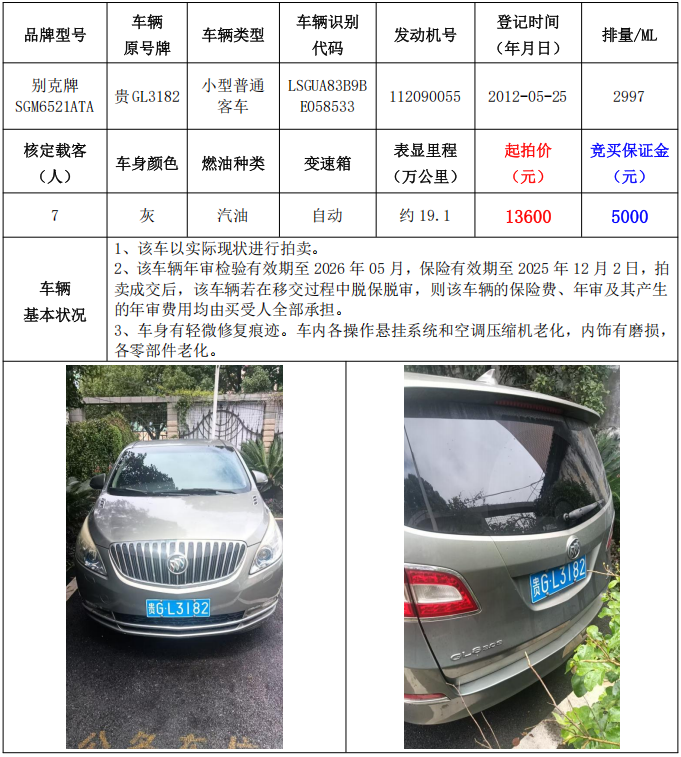 拍品編號(hào)3:別克牌SGM6521ATA小型普通客車(chē)(車(chē)輛原號(hào)牌:貴GL3182)
