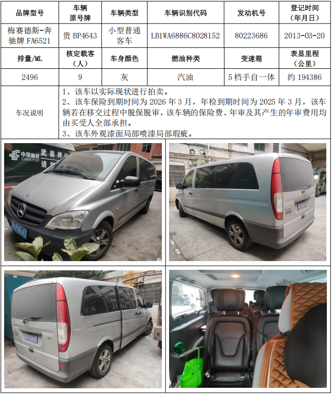 拍品編號(hào)4:雪佛蘭牌SGM6470TAAD小型普通客車(chē)1輛、梅賽德斯-奔馳牌FA6521小型普通客車(chē)1輛,共計(jì)2輛,整體拍賣(mài)