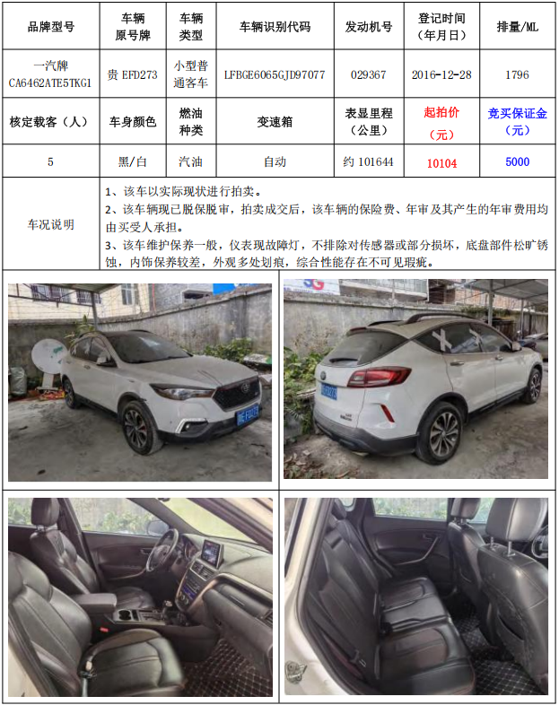 拍品編號1:一汽牌CA6462ATE5TKG1小型普通客車1輛(車輛原號牌:貴EFD271)