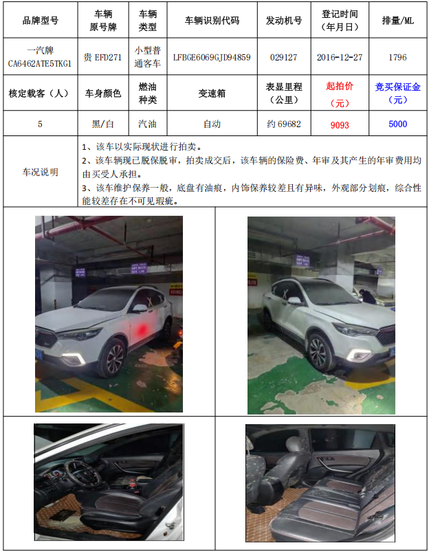 拍品編號3:一汽牌CA6462ATE5TKG1小型普通客車1輛(車輛原號牌:貴EFD273)
