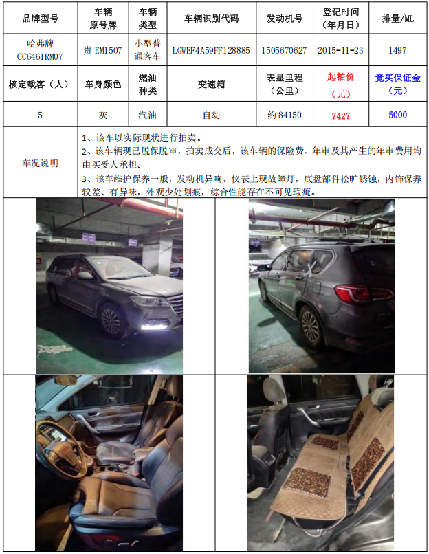 拍品編號6:哈弗牌CC6461RM07小型普通客車1輛(車輛原號牌:貴EM1507)